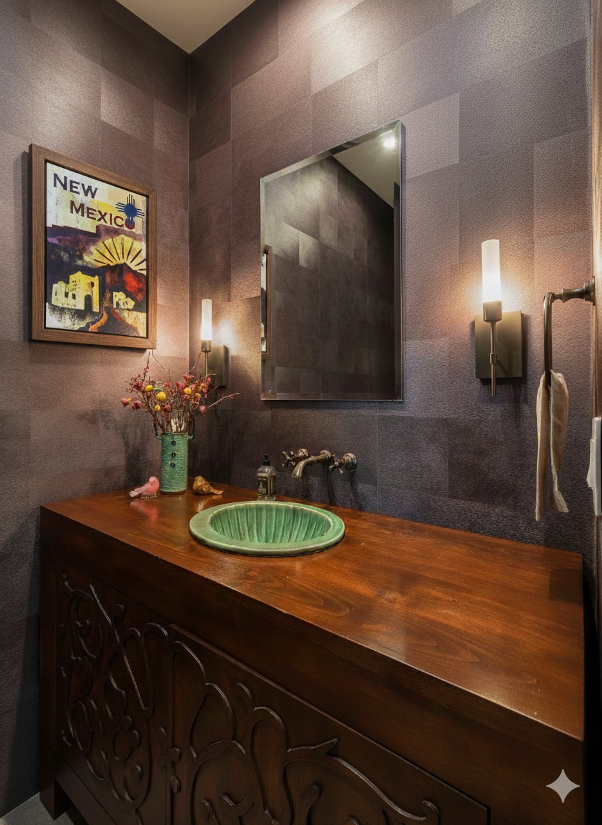 I created custom Cricut stencils from my own designs — the Zia symbol, the state outline, adobe architecture, and the words New Mexico. The earliest paint layers pull directly from the colors of the land itself, followed by layered abstract patterning. Read more below...